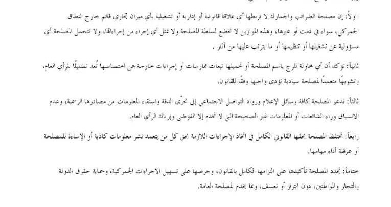 اولاً: إن مصلحة الضرائب والجمارك لا تربطها أي علاقة قانونية أو إدارية أو تشغيلية بأي ميزان تجاري قائم خارج النطاق الجمركي، سواء في دمت أو غيرها، وهذه الموازين لا تخضع لسلطة المصلحة ولا تمثل أي إجراء من إجراءاتها، ولا تتحمل المصلحة أي مسؤولية عن تشغيلها أو تنظيمها أو ما يترتب عليها من آثار.